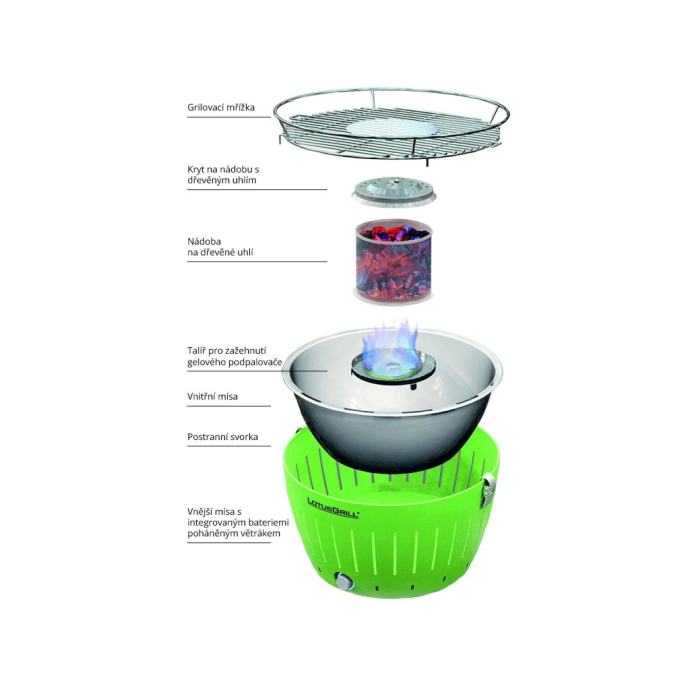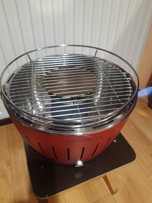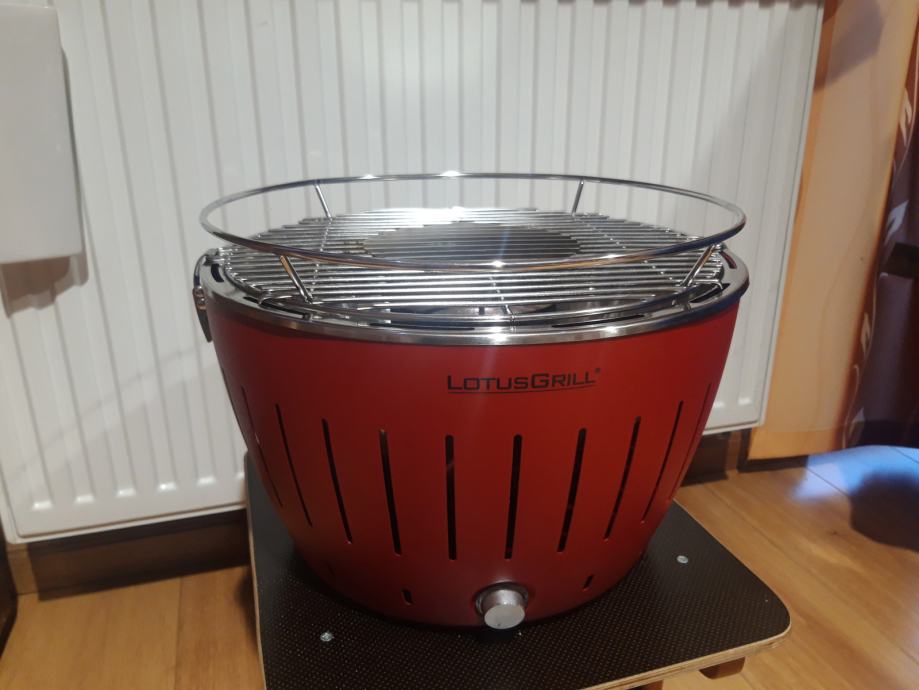 Izuzetno kvalitetan i vrlo praktičan bezdimni Njemački roštilj LOTUS GRILL za korištenje bez dima i bez ikakvog prljanja. Za vani u prirodi ili u svom domu. Apsolutno bez bilo kakvih nečistoca u prostoru. U unutrašnju posudu u centralnom dijelu roštilja postavi se drveni ugljen zapali se kocka između briketa i upali se brlo mali i tihi ventilator pokretan 4 baterije 1,5 V koji puše i raspiruje žar. Izuzetno brzo zazaruje. Apsolutno bez dima. Po potrebi se samo doda briket i tako održava temperatura. Nema neugodnih mirisa izgaranja jer ulje ili mast ne može doći na žar. Na njemu se može peći meso, povrće, peci i palačinke te i gotova pica u foliji, i drugi brzi pripravci na otvorenom ili u stanu. Vrlo je jednostavno održavanje. Vanjsko kuciste je od debelog čelika a sve ostalo od inoxa. Kupljen je prije 4 mjeseca u Njemačkoj i plaćen 250 eura. Prodajem ga za 90 eura. Mob 095 350 0722.