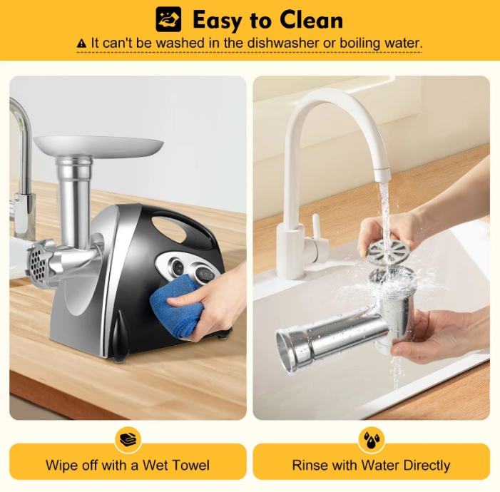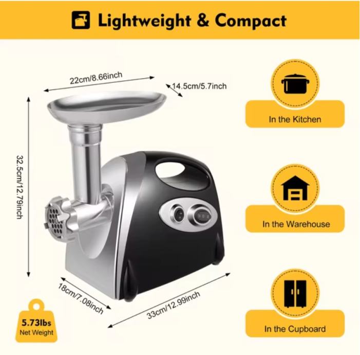 Mlinac za meso ima snažnu snagu od 800 W, brzinu rotacije od 190 o/m i visoku učinkovitost mljevenja od približno 1,5-2 kg/min, što vam daje snažnu snagu i osigurava da se vaša hrana može brzo samljeti i lako.