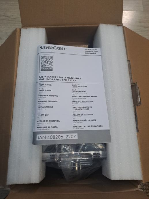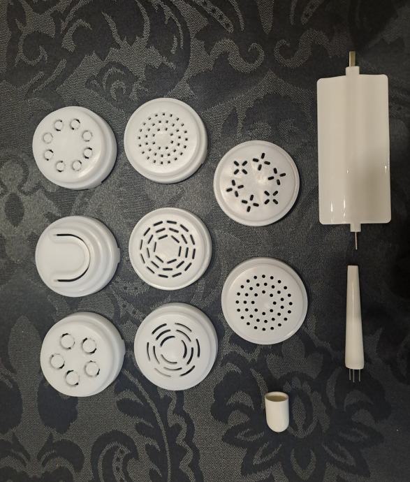 Aparat sadrzi 8 modlica za izradu tjestenine, modla za raviole, dvije mjerice za brasno i vodu, rezac tjestenine te čistač modlica.