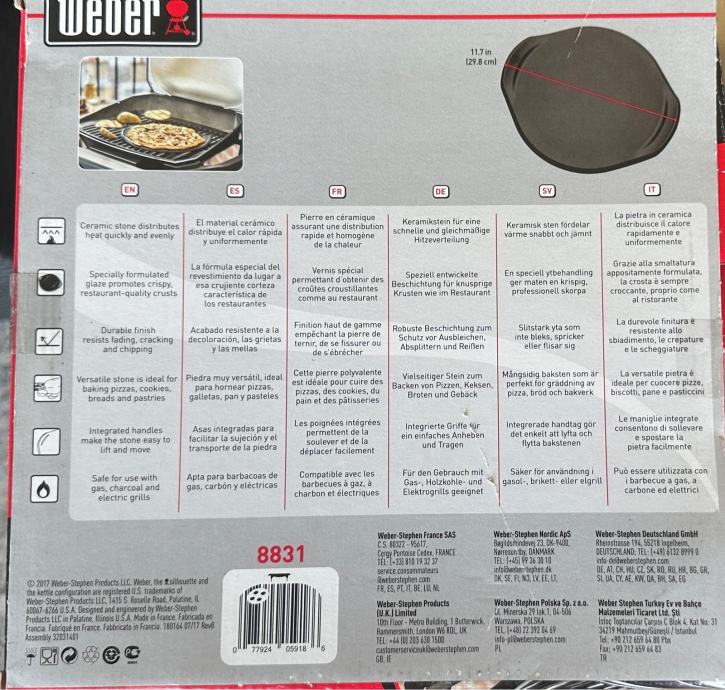 Prodajem Weber kamen za pizzu (manji). Kamen sam koristio ukupno 2 puta te je stanje kao novo (vidljivo na slikama). Kamen sam koristio na Weber Q1200 plinskom roštilju. Kamen je moguće osobno preuzeti u Zagrebu. Obzirom na lomljivost kamena i na to da ne mogu garantirati da će isti biti dostavljen u jednom komadu, ne šaljem poštom.