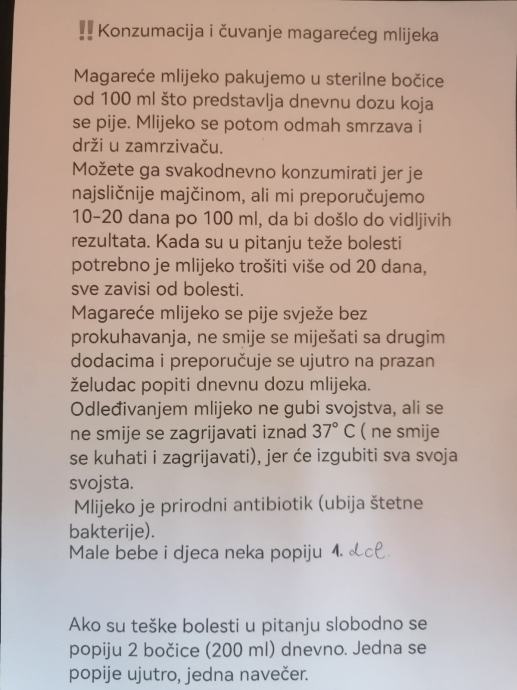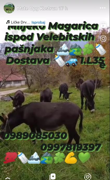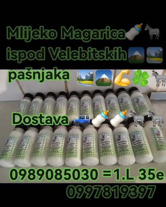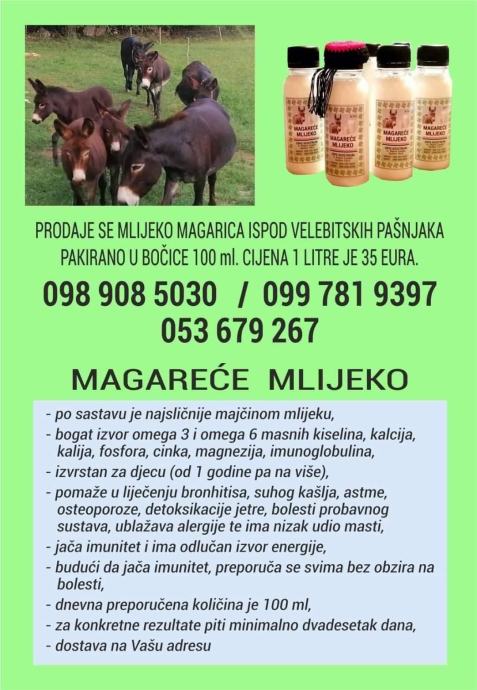 Mlijeko Magarica ispod Velebitski pašnjaka pakirano u bočice od 100 ml dostava na području LIČKO-SENJSKE ŽUPANIJE, ZAGREBA I ZAGREBAČKE ŽUPANIJE , RIJEKE I PRIMORSKO GORANSKE Ž, KARLOVAČKE I ZADARSKE ŽUPANIJE. Itd.. Mob. 0989085030 0997819397 053679267. Na facebook Magareće mlijeko OPG KOSTRUN i facebook Mate Opg Kostrun možete pogledati video uradake sa našeg Opg. Mlijeko je 100%vrhunske kvalitete jer dolazi ispod Velebitski pašnjaka, mlijeko možete provjeriti o trošku našeg Opg. Hvala