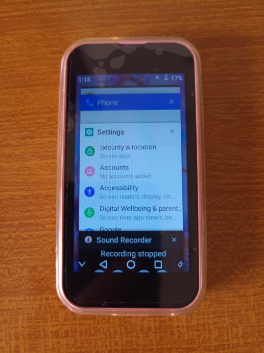 Prodajem novi fvh mini pametni telefon, dimenzije: 9x4,5x0,8 cm. Maskica je roza boje.