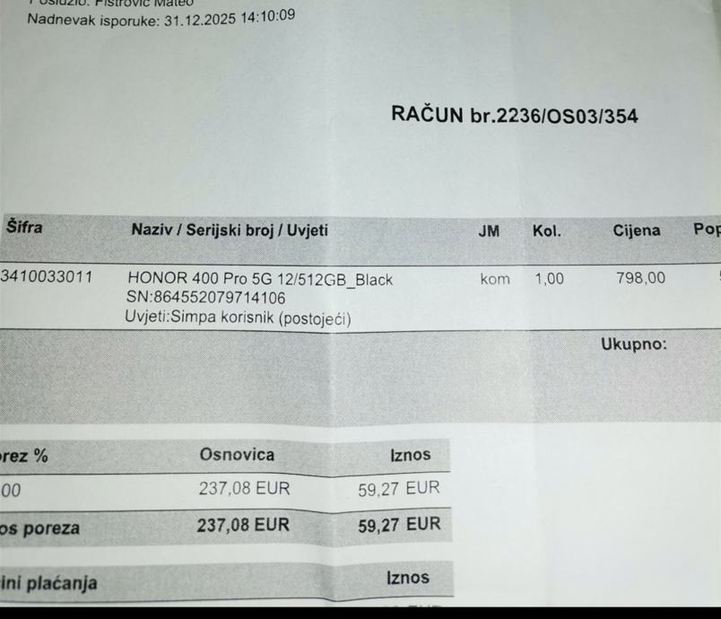 Honor 400 Pro, crne boje, mem 12GB/512GB. Kupljen u HT-u. Posjedujem račun (garancija). Mobitel nije vađen iz kutije, originalno je tvornički zapakiran.