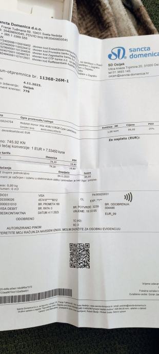račun u prilogu,u Osijeku,mogućnost slanja poštom,plaćen 99€.