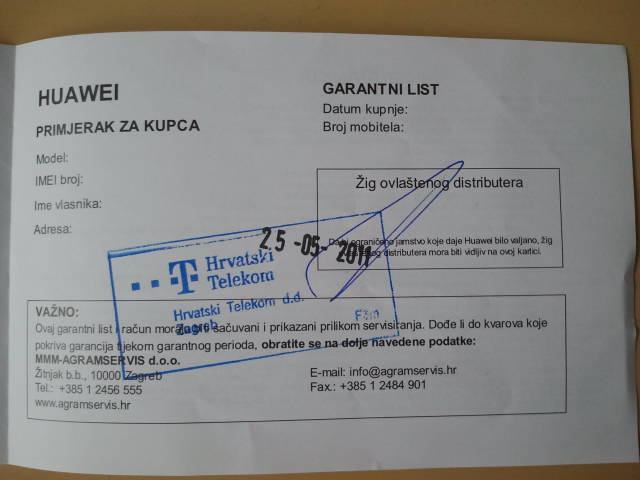Mobitel je kupljen u BonBon shopu te ima T-mobile garanciju koja vrijedi od 25.5.2011. pa 24 mjeseci kao što se vidi na slici.
