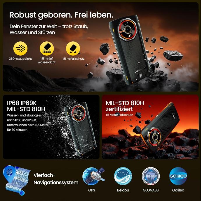 Prodaje se žuti LAGENIO Panther2 Pro je izdržljiv smartphone s Android 15 i Octa-Core procesorom, dizajniran za rad u ekstremnim uvjetima, s IP68/IP69K i MIL-STD-810H certifikatima. Ima do 24GB (8+16GB) RAM-a, 256GB interne memorije i podršku za proširenje do 1TB te naprednu 50MP AI kameru s Widevine L1 certifikatom za kvalitetan video streaming. Usprkos robusnoj konstrukciji, lagan je i tanak, sa samo 11,3 mm debljine i težinom od 266 grama, a opremljen je 6,7-inčnim 120Hz zaslonom zaštićenim Gorilla Glass 5, baterijom od 5150mAh s brzom naplatom i dodatnim funkcijama poput NFC-a, navigacije i prepoznavanja lica.