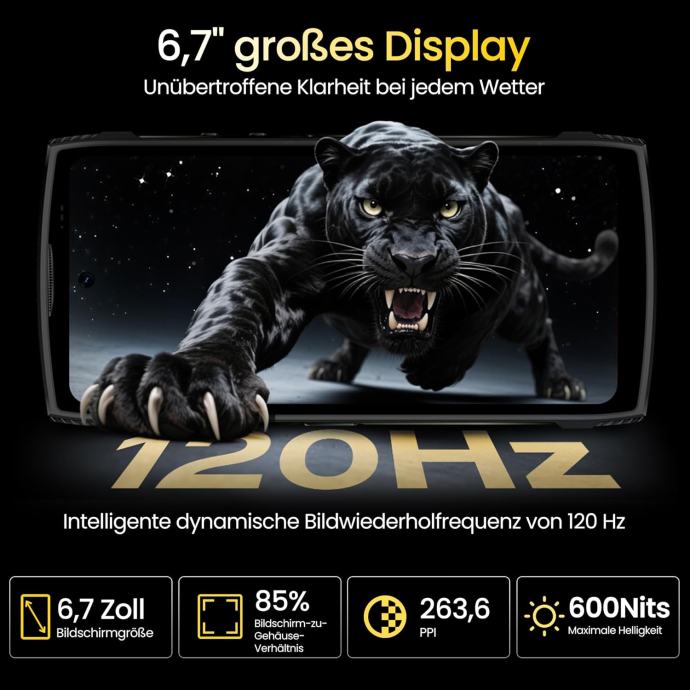 Prodaje se žuti LAGENIO Panther2 Pro je izdržljiv smartphone s Android 15 i Octa-Core procesorom, dizajniran za rad u ekstremnim uvjetima, s IP68/IP69K i MIL-STD-810H certifikatima. Ima do 24GB (8+16GB) RAM-a, 256GB interne memorije i podršku za proširenje do 1TB te naprednu 50MP AI kameru s Widevine L1 certifikatom za kvalitetan video streaming. Usprkos robusnoj konstrukciji, lagan je i tanak, sa samo 11,3 mm debljine i težinom od 266 grama, a opremljen je 6,7-inčnim 120Hz zaslonom zaštićenim Gorilla Glass 5, baterijom od 5150mAh s brzom naplatom i dodatnim funkcijama poput NFC-a, navigacije i prepoznavanja lica.
