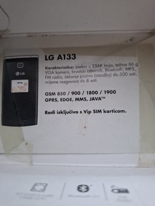 LG A 133 compact na slikama.Ispravan nova baterija sve radi. Imam punjac ima hrvatski meni imam papire i racun.neostecen bez ogrebotine.VIP mreža (A 1).Razlog prodaje smanjenje kolekcije.Dostavljam ISKLJUČIVO HP pouzećem.Zamjene ne trebam