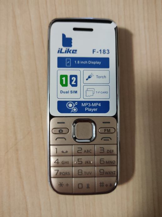 Novi mobitel ILIKE F-183 Dual SIM kartice i mikro SD karticu. Mobitel je pogodan za starije osobe jer jednostavan za korištenje ima velike tipke. Ima tipku FM radio koji se dodirom FM tipke uključuje i isključuje. Led svjetiljku koja se tipkom O uključuje i isključuje. Zlatne boje kučište mobitela lijepo izgleda. Šaljem poštom ili Tiskom na Vaš trošak, a može se preuzeti osobno u Varaždinu.
