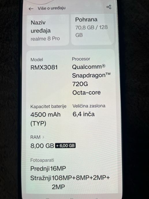 Realme 8 Pro, 128gb, ocuvan, cijelo vrijeme bio u maskici sa staklom. Vrhunske fotografije. Kamera straznja 108MP (Samsungova kamera), prednja 14MP (Sony kamera). Punjac USB-C, dolazi uz mobitel. Ne radi bluetooth, izbacuje cesto. Ostalo sve ispravno i jako ocuvan. Osobno preuzimanje. Kupljen u Hrvatskoj, otvoren na sve mreze.
