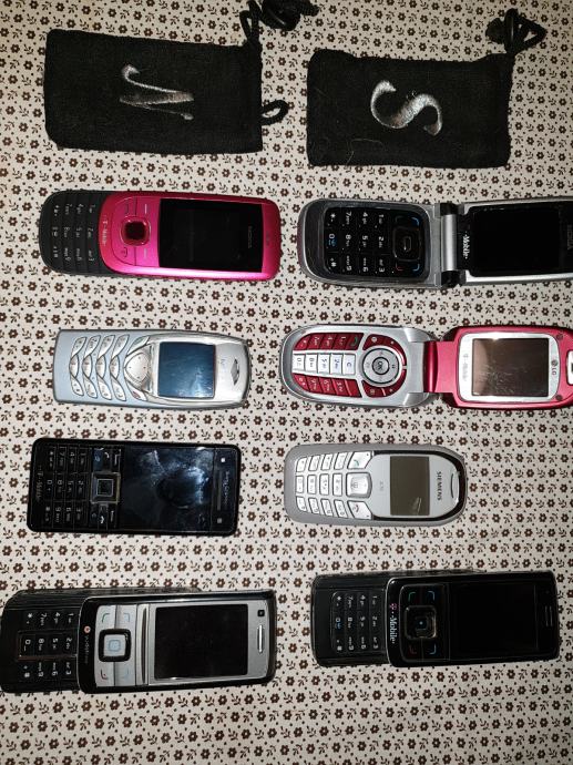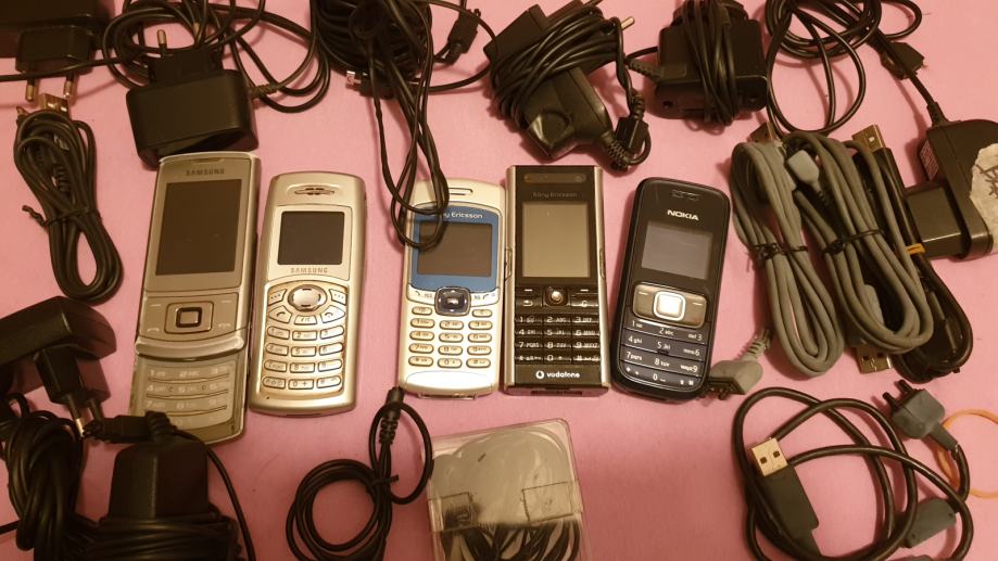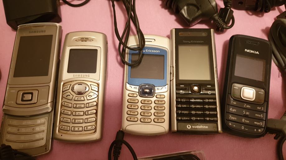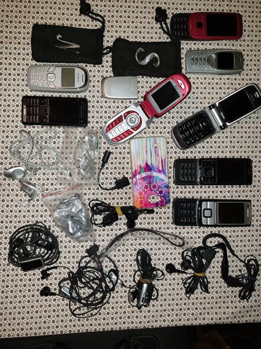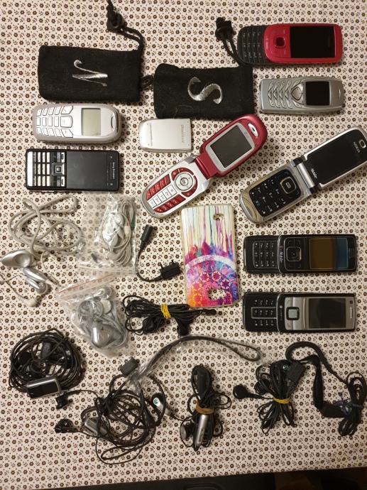 Stari mobiteli kao na slici , punjači i pribor. Dodao sam i još 5 komada na drugoj slici za istu cijenu.