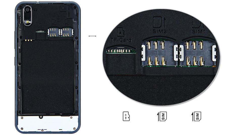 Dual SIM (2x Micro SIM) + memoriska TF/micro SD,