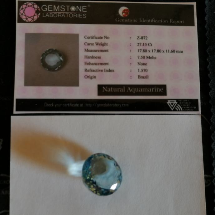 Prirodni Aquamarine 27.15 CT certificiran dragi kamen.