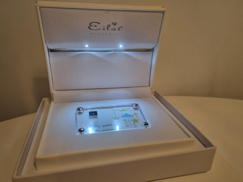 Pločica sa dijamntom nalazi se u elegantnoj, osvjetljenoj, bijeloj, kožnoj kutijici.