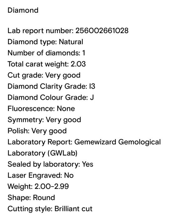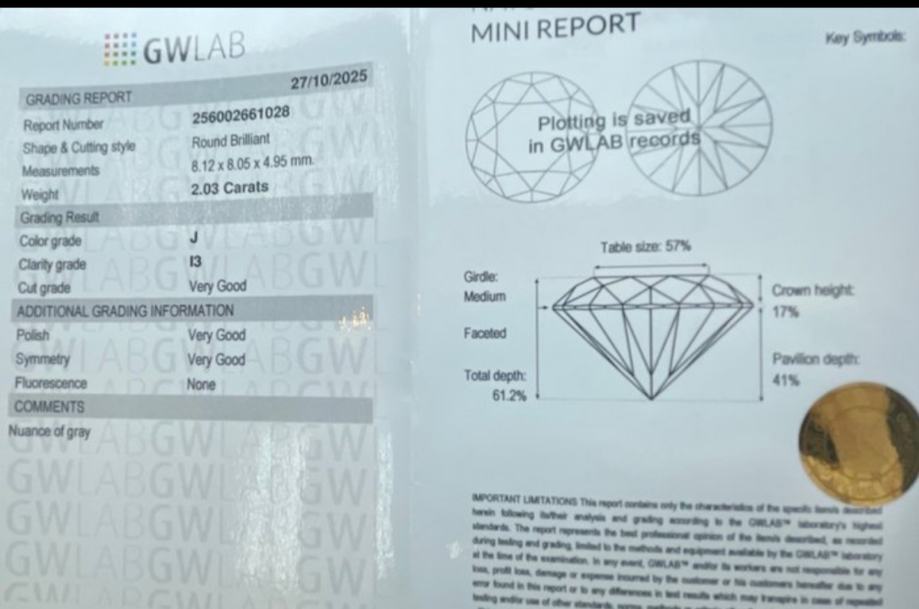 Prodajem prirodni certificirani dijamant težine 2,03 karata, okruglog briljantnog oblika. Dijamant dolazi sa službenim GWLAB certifikatom koji potvrđuje njegovu J boju i I3 čistoću.