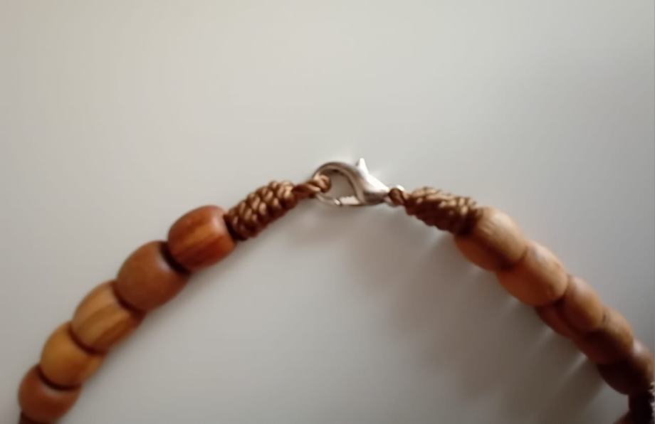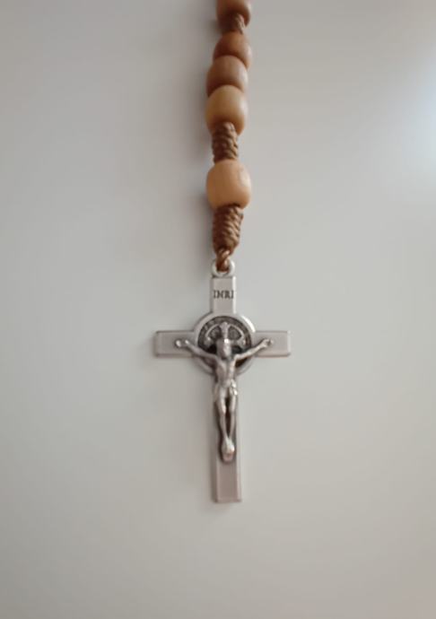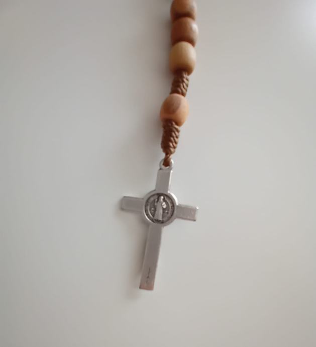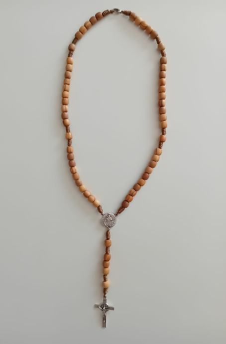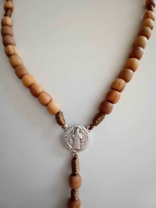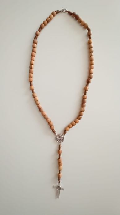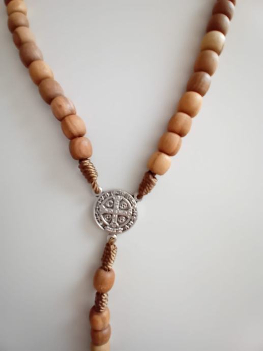Nova, ručno pletena krunica od maslinovog drva sa medaljicom i križem svetog Benedikta. Krunica sa kopčom koja se može nositi i kao ogrlica.