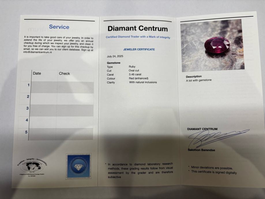 Prirodni rubin impresivne veličine od 3,46 karata, kupljen kod renomiranog trgovca Diamant Centrum (Amsterdam).