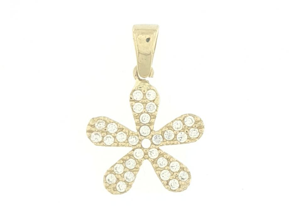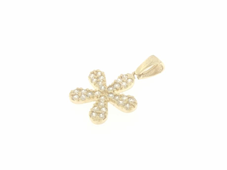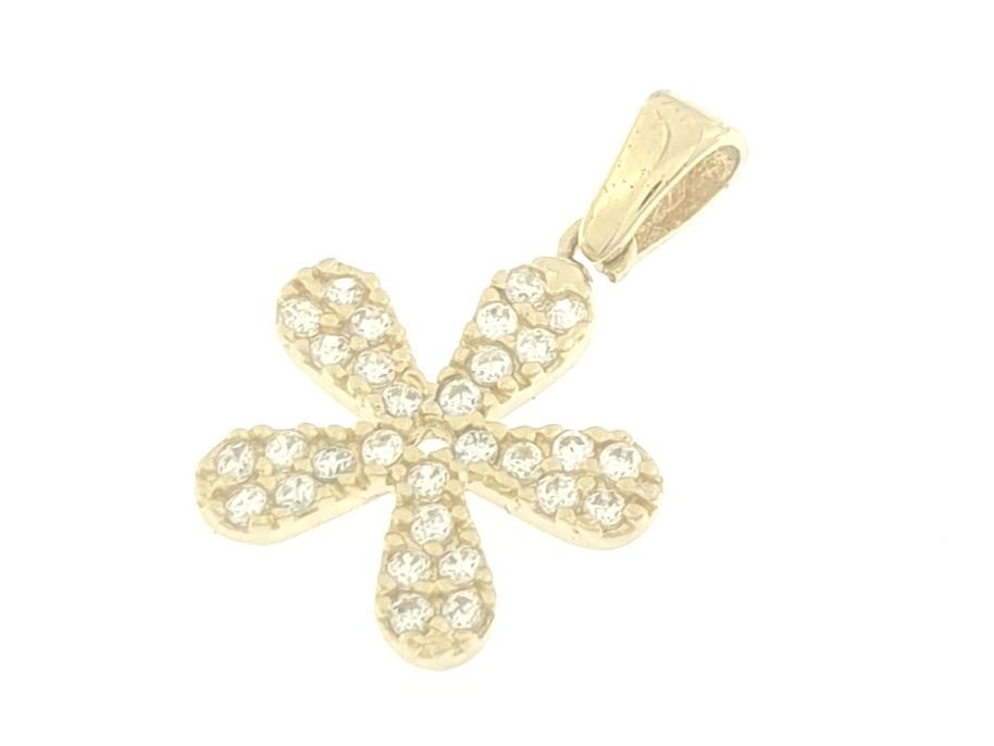 Zlatni privjesak cvijetić, bijeli cirkoni, žuto zlato 14K, štambilj 585, trokutasta karika.