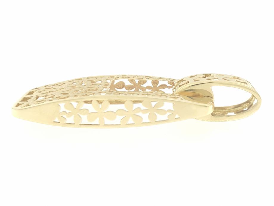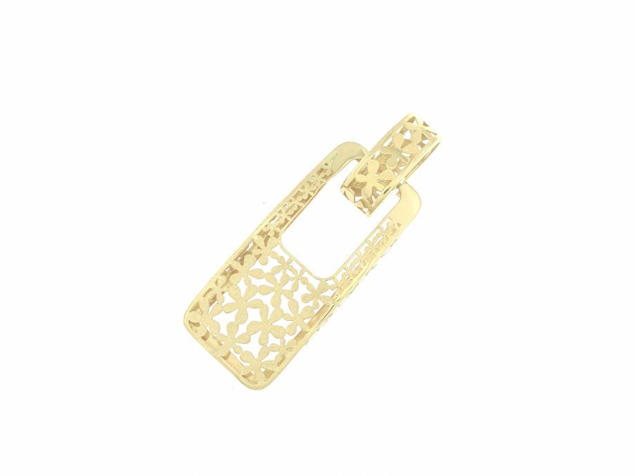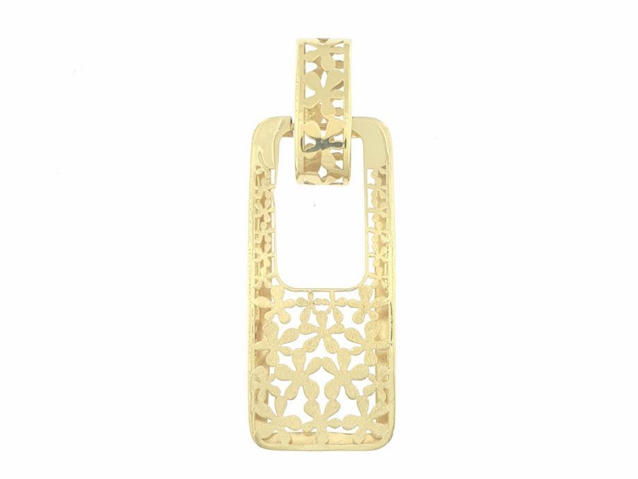 Zlatni privjesak četvrtasti filigranski, žuto zlato 14K, žig 585, glat-mat, ispunjen cvijetićima.