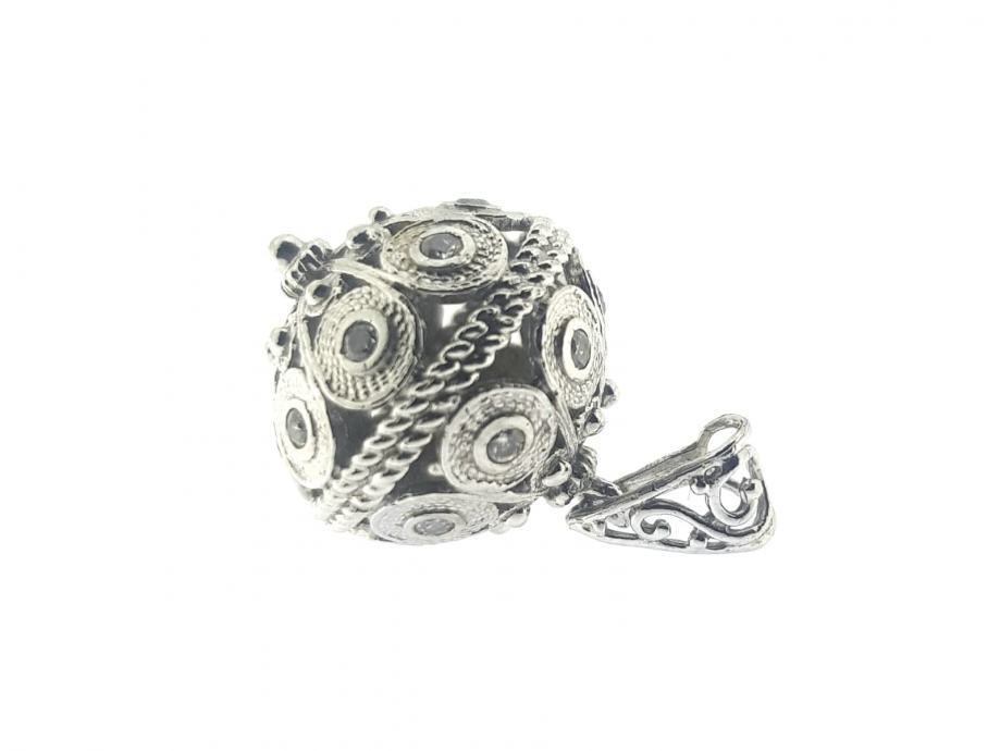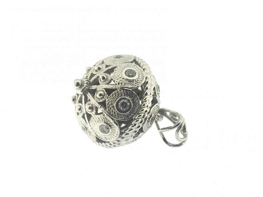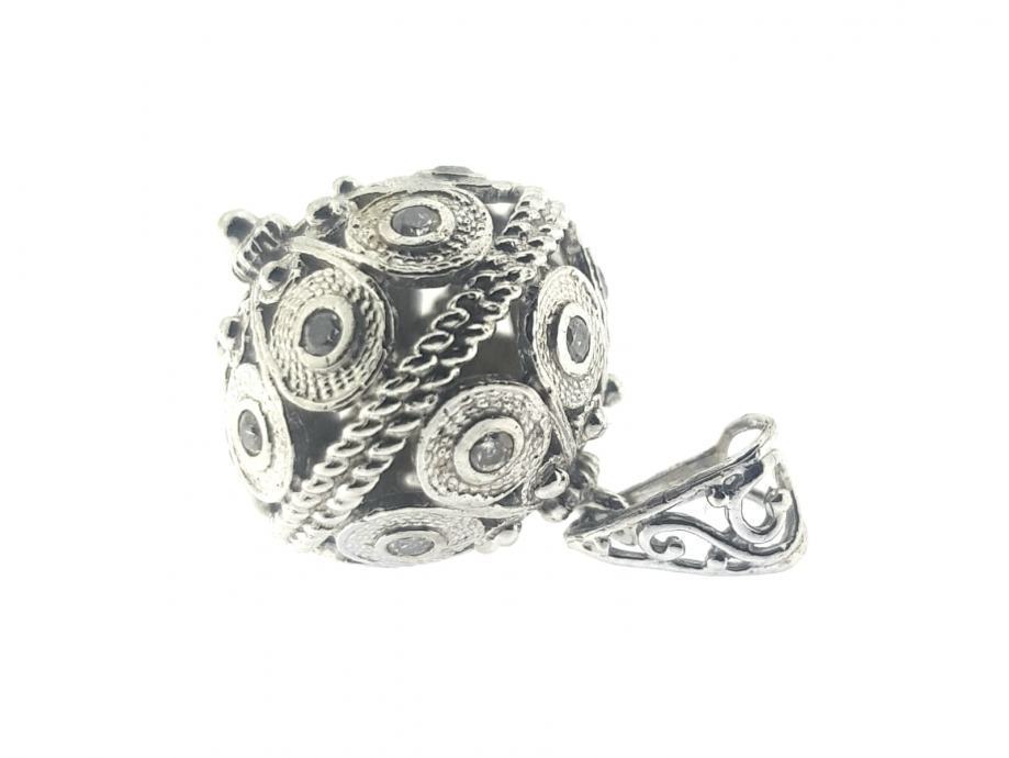 Zlatni privjesak šibenski botun, kuglica s cirkonima, tradicionalni hrvatski dalmatinski nakit, bijelo zlato 14K, žig 585, trokutasta karika.