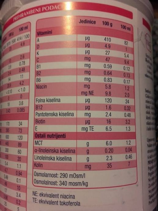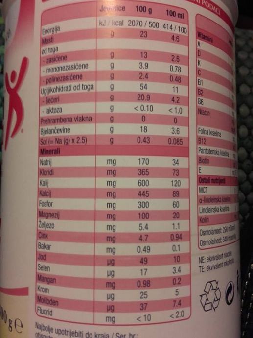 Sastojci: Glukozni sirup, kazein (mlijeko), sukroza, mliječna mast, srednje lančani trigliceridi, minerali