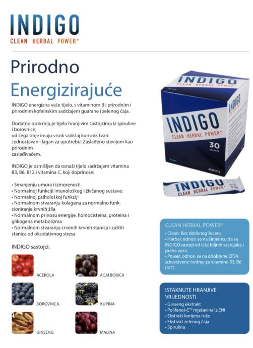 INDIGO je biljni napitak proizveden u Danskoj kojeg nema u maloprodaji, a njegova je namjena podizanje energije na prirodan način. Jednu se vrećicu praška prema uputama na ambalaži treba umiješati u 250 ml vode, ali se za blaži okus preporučuje doza od 0.4 do 0.5 litara ili podijeliti sadržaj vrećice na 2 porcije. Kutija sadrži 30 vrećica od 9.3g.