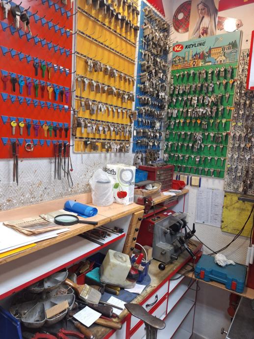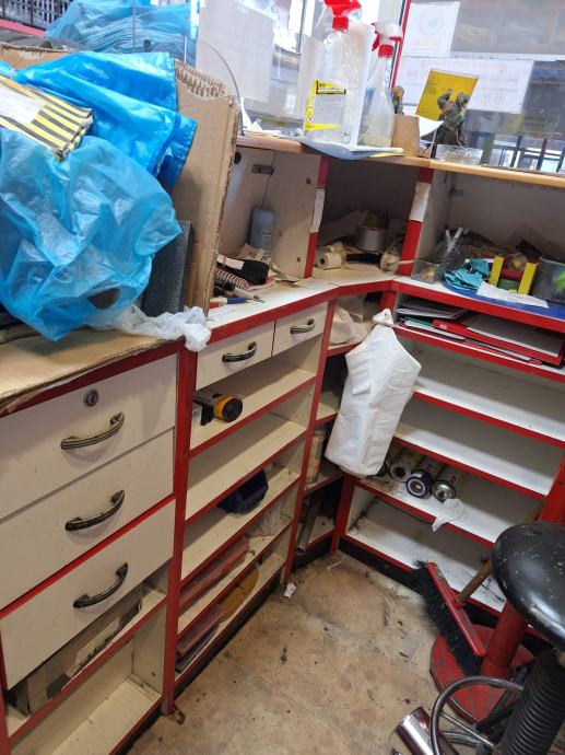 -Kompletan namještaj radione – radni stolovi s ladicama, ormarići, stalci, police i još puno toga