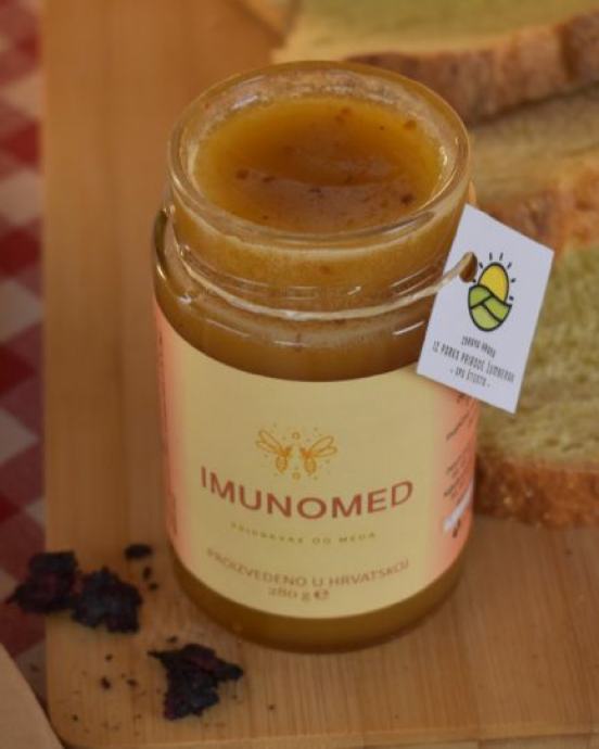 Imunomed je pripravak od meda koji sadrži prirodne pčelinje proizvode, cvjetni i kestenov med, propolis, cvjetni prah, matična mliječ i đumbir. Sadržaj staklenke je 280g.