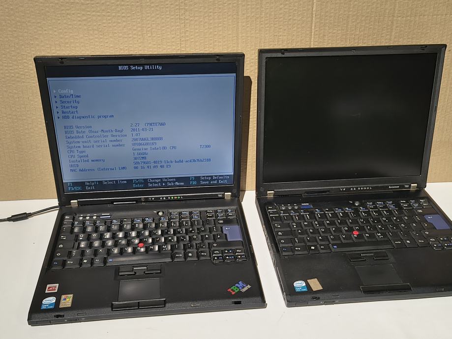 Na prodaju dva Lenovo ThinkPad laptopa. Oba se pale i dolaze do BIOS-a, ali ne učitavaju operativni sistem. Smatramo da je potrebna instalacija Windowsa ili drugog OS-a. Dalje testiranje nije rađeno.