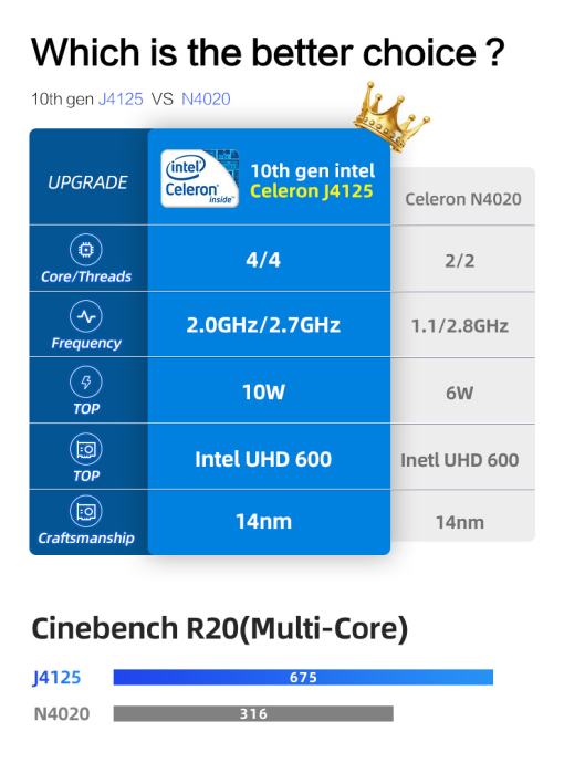 •CPU: Intel® Celeron® Processor J4125 Quad-Core