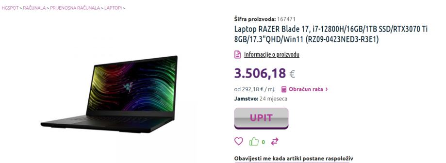 Specifikacije: i7-12800H, 3070Ti, 1TB SSD, 16GB DDR5 (može do 64), QHD 240Hz.