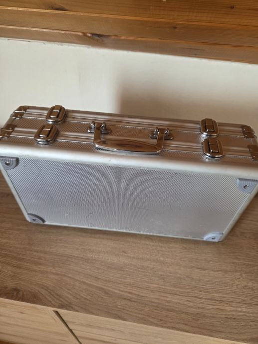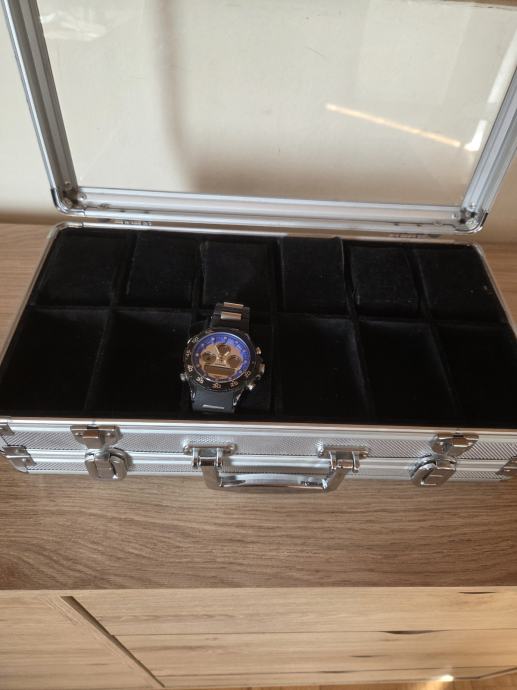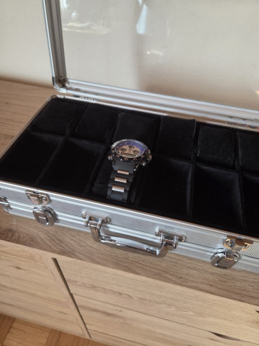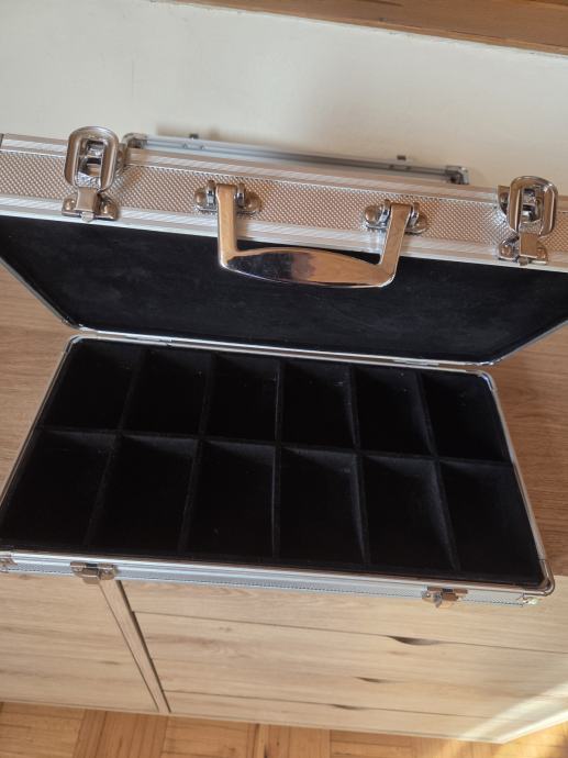 Aluminijski kofer za satove ili ostalo na dva nivoa sa po 2×12 pretinaca obložen kvalitetnom crnom cojom. Dimenzije 38/21/12 cm.