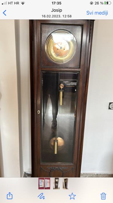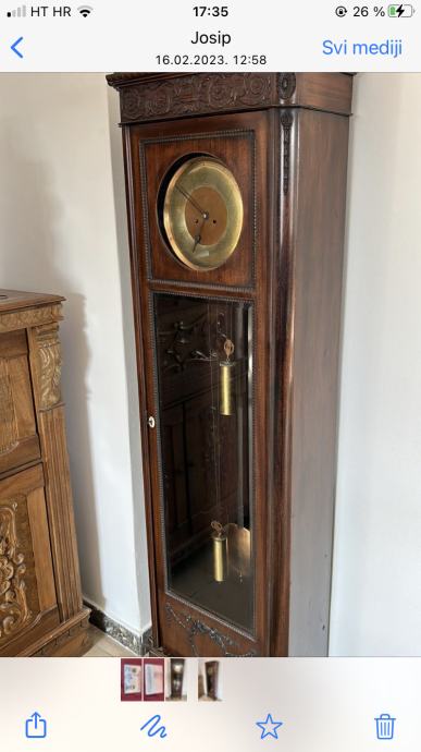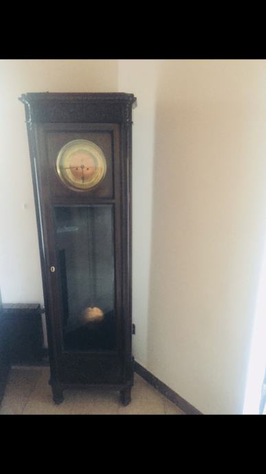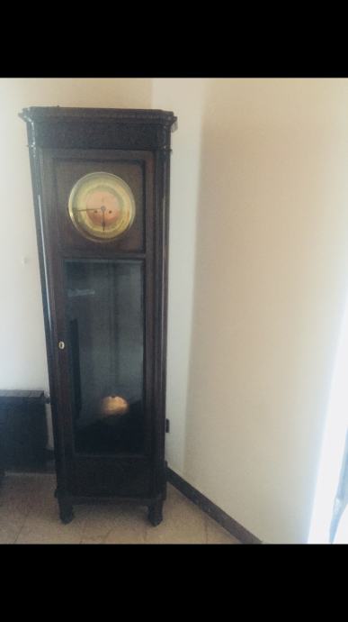 Na prodaju: Elitan unikatan podni sat od masivnog drva, dimenzija 185x56x38cm, ručne izrade s dva utega, klatnom i predivnim rezbarijama, visokog sjaja. Mehanizam ispravan. Uščuvan, korišten više kao ukras, bez oštećenja. Uživo dolazi do izražaja grandiozna ljepota ovog skupog primjerka.