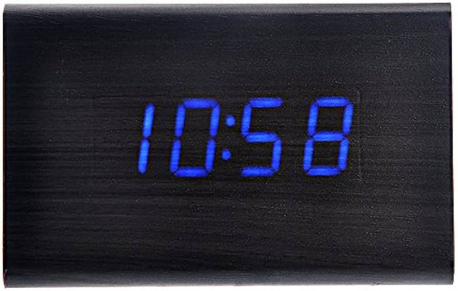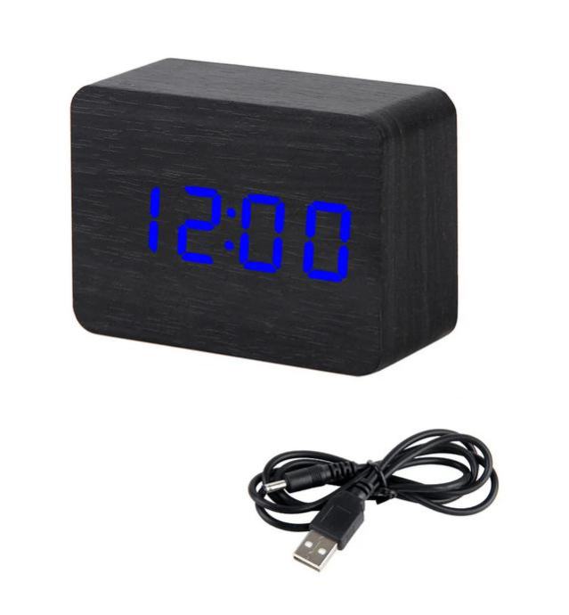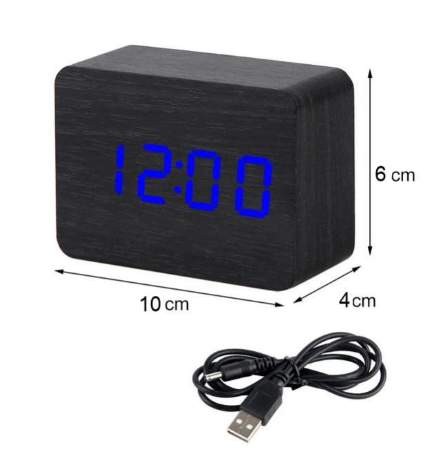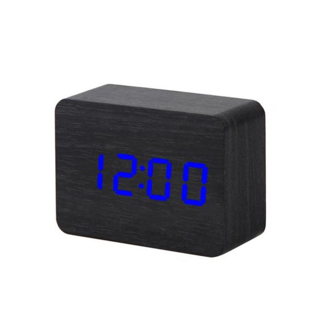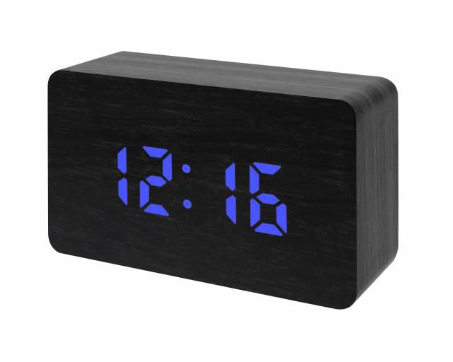 Digitalni crni stolni sat / imitacija drva/ LED plavi prikaz brojeva