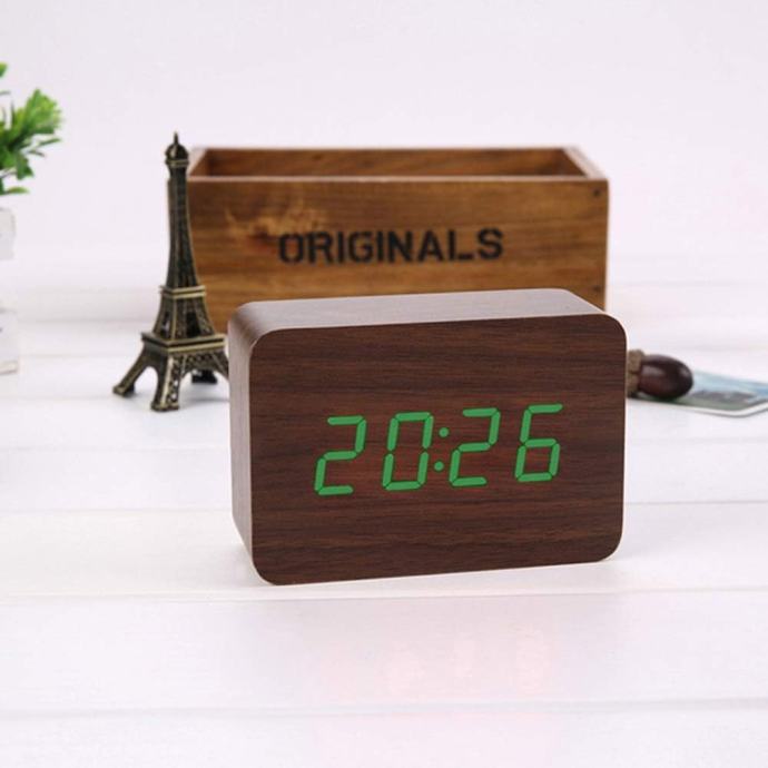 Digitalni drveni stolni sat budulica, moderan LED sat a izgleda kao komad drveta sa nekoliko opcija rada, prikaz vremena, datuma, temperature.