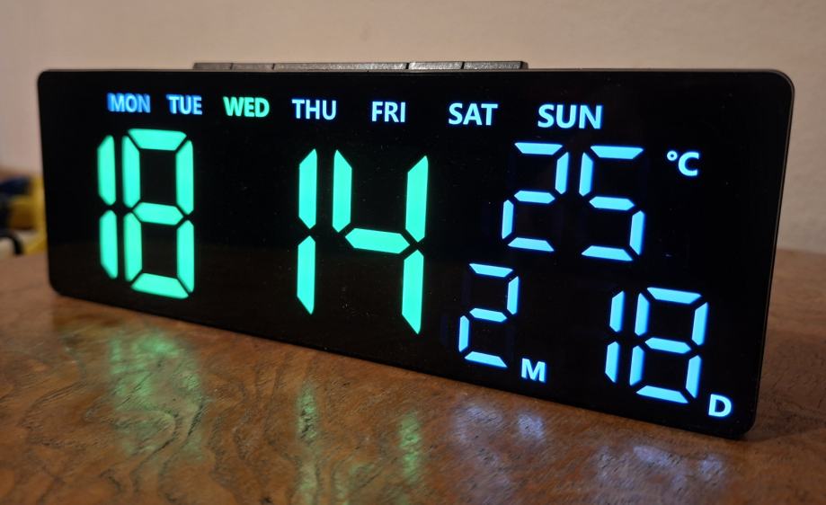 Prodajem digitalni sat, u zeleno-crnoj varijanti. Sat pokazuje vrijeme, datum, dane i temperaturu.