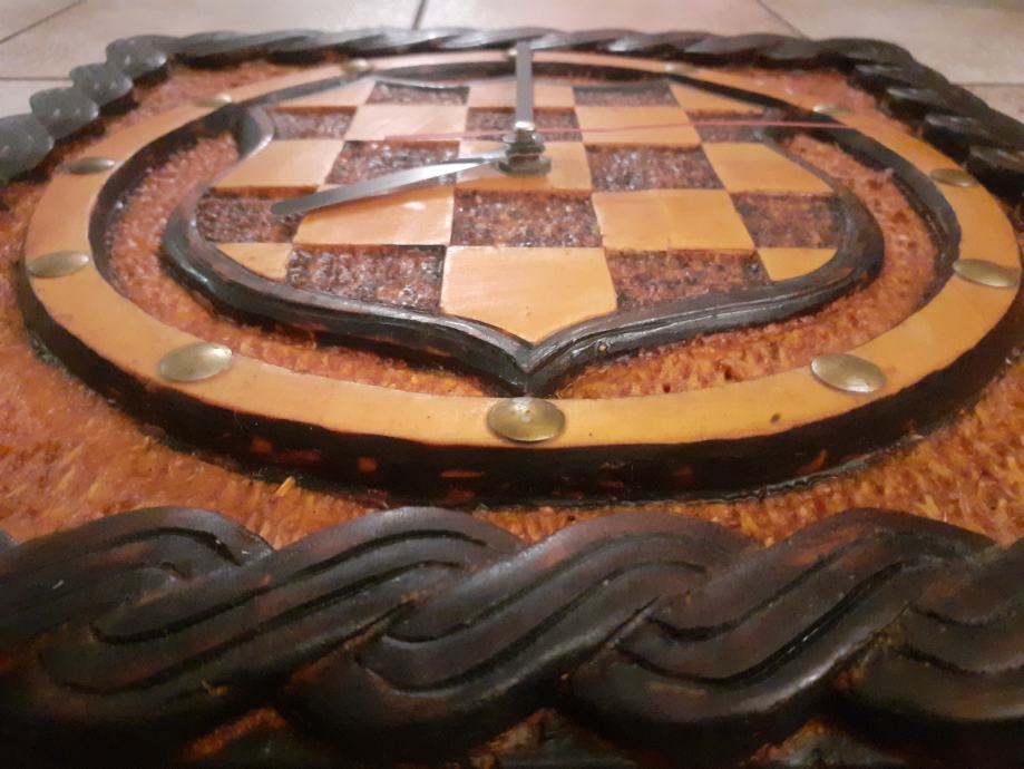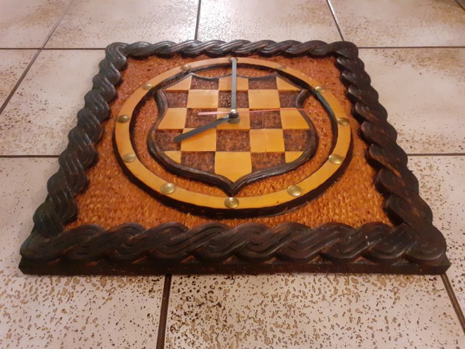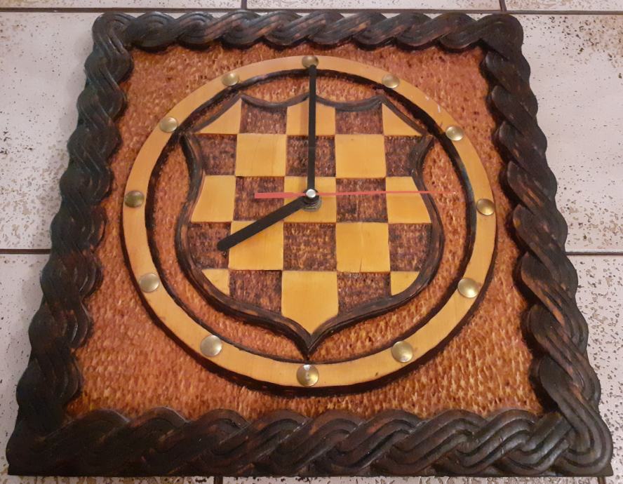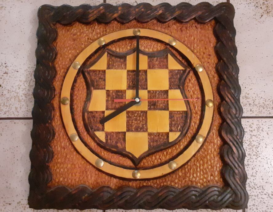 Prodajem drveni zidni sat, ručni rad, unikat, motiv: stari Hrvatski grb + okolo pletivo. Dimenzije sata su 30 cm x 30 cm, dok je debljina 2 cm, sat radi na jednu AA bateriju.