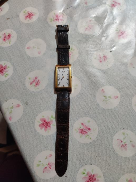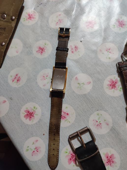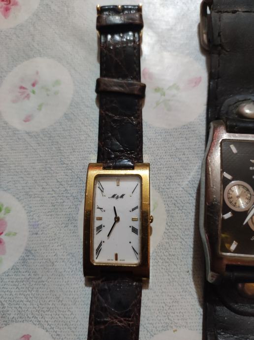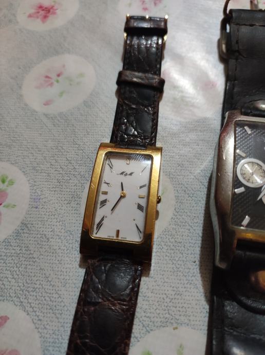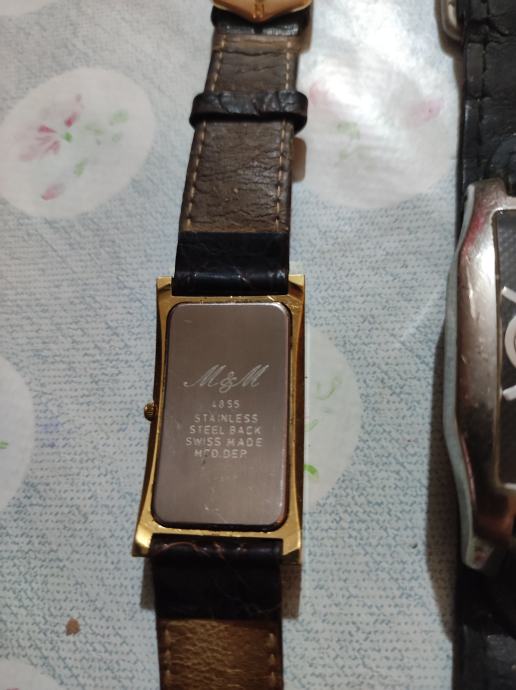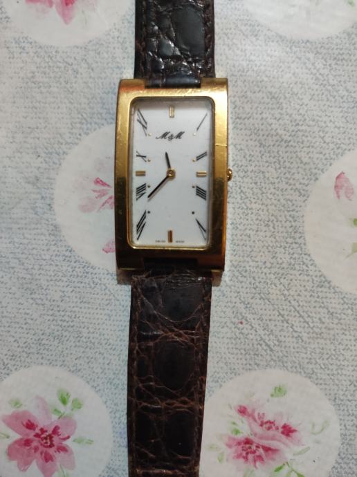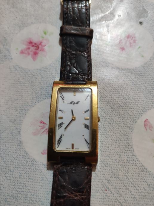M/M swiss sat s pravokutnim zlatnim kućištem i kožnim remenom tamno smeđe boje. Elegantnog je dizajna s bijelom pravokutnom brojčanicom i rimskim brojevima. Sat je u dobrom stanju i idealan je modni dodatak za svakodnevno nošenje.