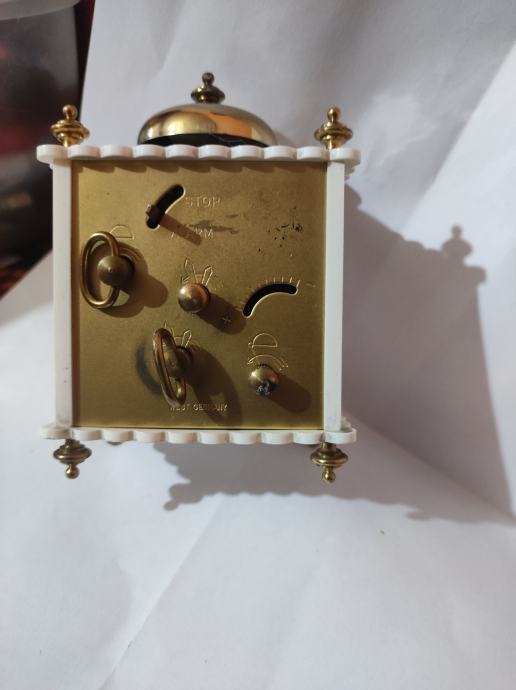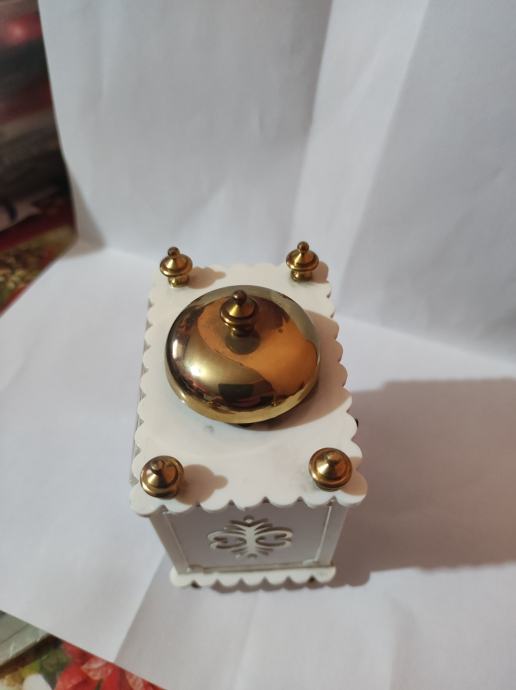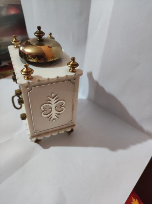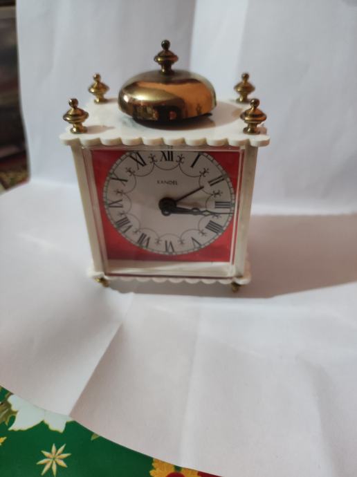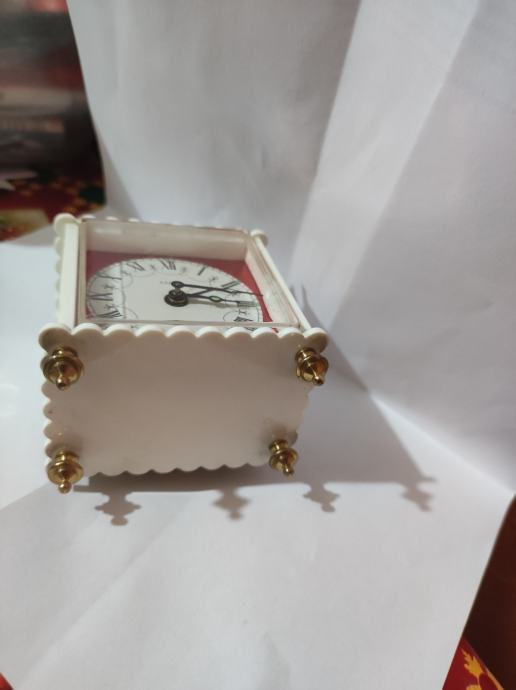 Prodajem Phinney Walker Kandel stoni sat budilica u vintage stilu. Ispravan i tocan. Sat ima elegantno bijelo kućište s dekorativnim zlatnim detaljima - četiri ukrasna vrha na uglovima i zlatnu kupolu na vrhu. Brojčanik je okružen crvenim okvirom, s rimskim brojkama i crnim kazaljkama. Kućište je četvrtastog oblika s blago zaobljenim rubovima. Visina 10cm sirina 7cm