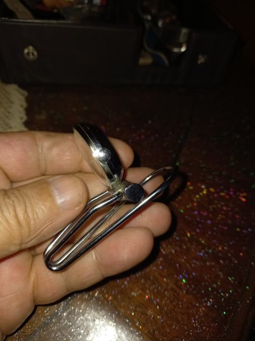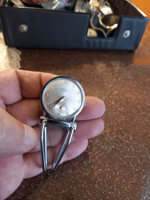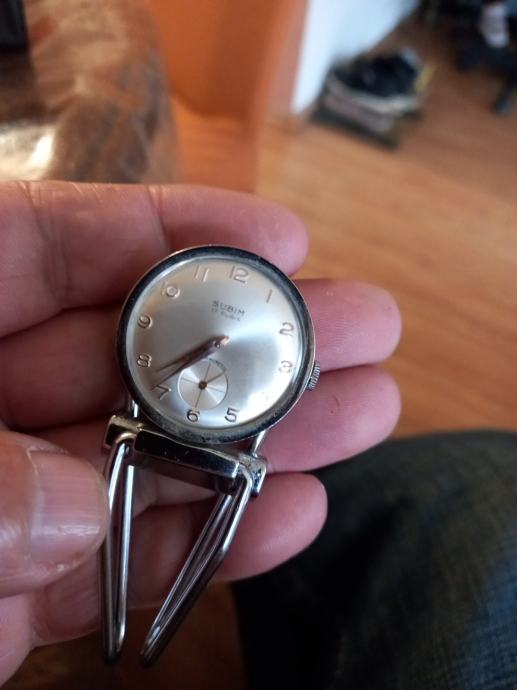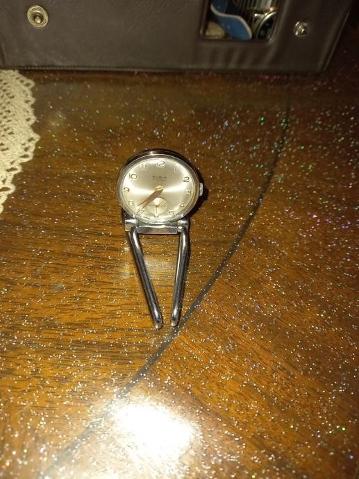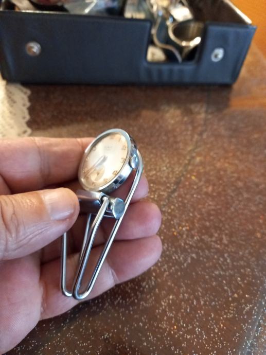 Prodajem rabljeni sat na navijanje s metalnim postoljem u obliku kopče. Radi se o manjem satu okruglog oblika, srebrne boje, s klasičnim brojčanikom i sekundnom kazaljkom. Mehanizam je na navijanje, bez baterije. Metalno postolje omogućuje postavljanje sata na ravnu podlogu.Sat je ispravan i kao nov