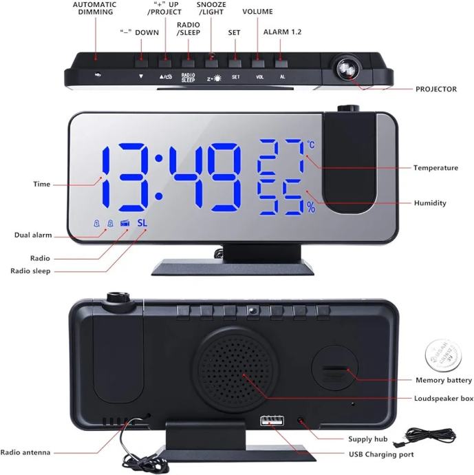 LED sat FM radio stanica Punjač mobitela Projektor Alarm