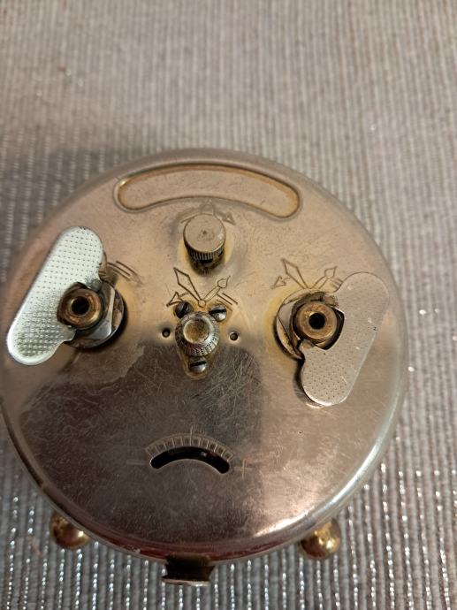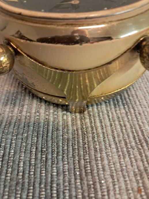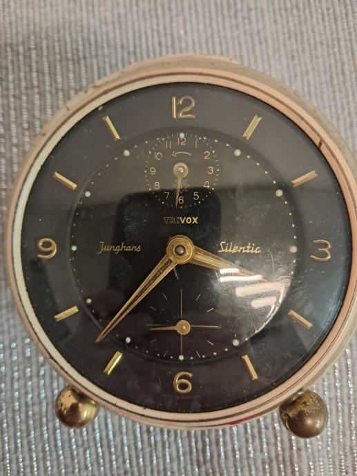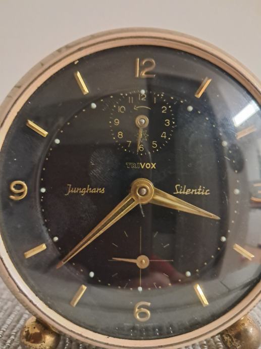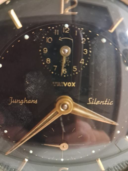 Prodajem rabljeni stolni sat Junghans Silentik s crnom brojčanicom i zlatnim detaljima u vintage stilu. Elegantan mehanički sat s metalnim kućištem i originalnim Trivox mehanizmom, očuvane funkcionalnosti unatoč znakovima korištenja. Sat ima dekorativno postolje s malim nožicama što ga čini lijepim ukrasnim detaljem za radni stol ili policu.