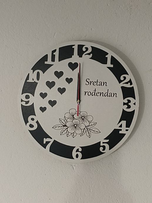 Poklonite unikat koji će trajati – zidni sat izrađen od visokokvalitetnog medijapana, savršen za svaki interijer. U elegantnoj crno-bijeloj kombinaciji, ovaj sat odlikuje se gravurom prekrasnog cvijeta i natpisom "Sretan rođendan", što ga čini idealnim darom za posebne trenutke.