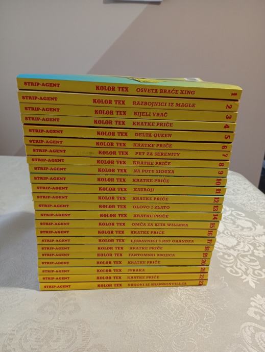 Prodajem stripove Tex Willer Kolor brojeve od 1 do 23 ( svi dosad izašli). Stripovi su u odličnom stanju jedamput čitani a cijena pojedinog stripa je 3 €. Stripovi se prodaju isključivo u kompletu, a preuzeti se mogu u Varaždinu i okolici ili se mogu poslati Tisak paketom na trošak kupca. Za sve ostale informacije broj mobitela 099 76 88 191.