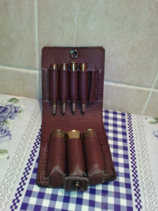 Prodajem kozni etui za kombinirano streljivo,kapaciteta 5 karabinskih metaka i 3 patrone,etui je novi i nekoristen,radeno po narudzbi 2 komada.Cijena 120 kn.