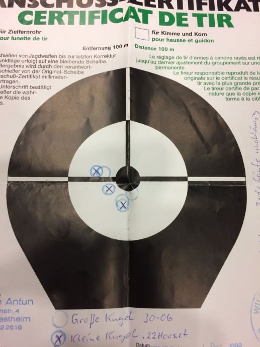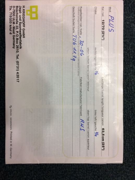 12/12-30-06 sa umetkom Krieghoff EL 65 kal. 22-Hornet, te optikom Kahles 3-12x56 sa osvijetljenom končanicom. Optika i umetak postavljeni su i upucavani u tvornici Krieghoff. Puška je vrlo malo korištena.