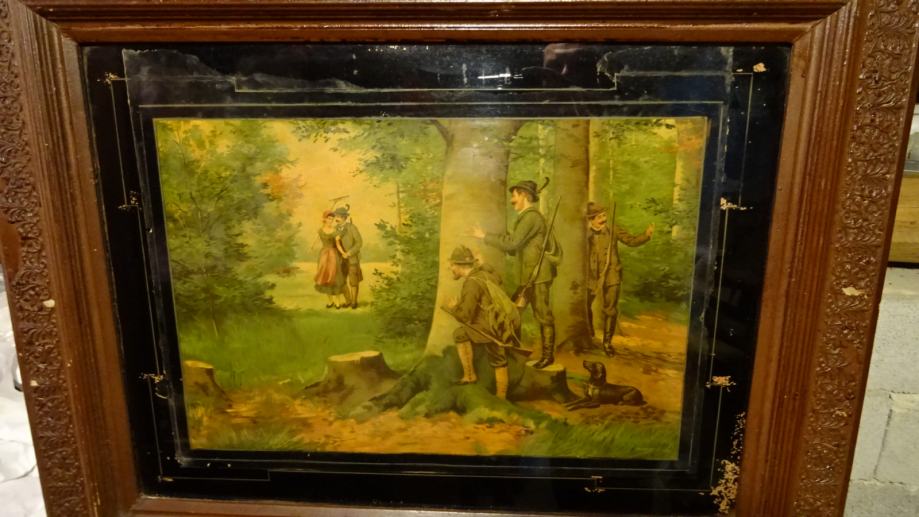 Lovaćka slika stara preko sto godina, nalazila se u lovačkoj sobi pokojnog djeda, dimenzije 80 x 67 cm. To je unikat, rućno radjen i rezbaren drveni okvir, kakvog danas nitko više ne radi zbog gubitka vremena, odlićan i prekrasan dar za lovca, za obljetnicu i slično. Moguća zamjena po dogovoru.