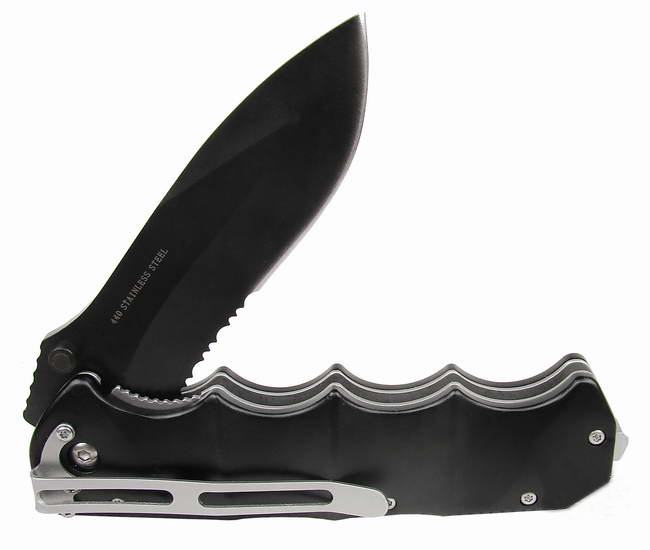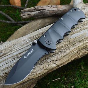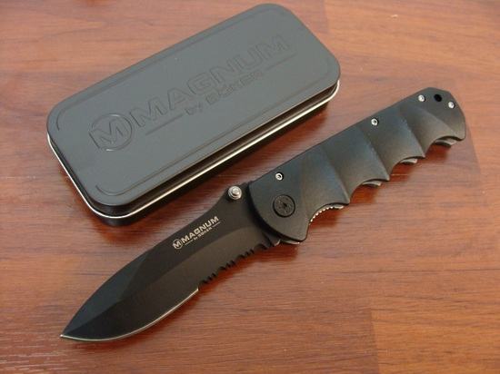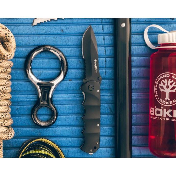 Ovaj taktički rasklopni nož Magnum Black Spear je pogodan za bilo koju misiju. Oštrica je izrađena od nehrđajućeg 440A čelika i ima blago zakrivljen spearpoint oblik (poput koplja), te je presvučena u crno i djelomično nazubljena, idealna za kidanje vlaknastih materijala. Krupan linerlock mehanizam sprječava slučajno sklapanje oštrice, a duboki utori za prste u crnoj aluminijskoj dršci osiguravaju siguran hvat (čvrsto držanje noža u ruci). Također sadrži završetak za razbijanje stakla, praktičnu kvačicu i rupu za uzicu.