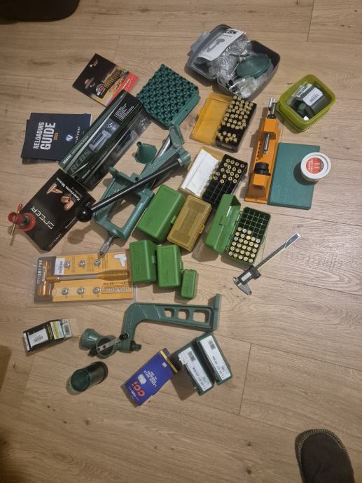RCBS - RC IV preša za reloading, Lyman universal trimmer za sve kalibre, RCBS uniflow 2 dozator baruta, Bullet puller od Smart reloadera - kinetički čekić za sve kalibre. Hornady powder trickler, RCBS držač čahura za velike i male kalibre, RCBS lijevak baruta, RCBS ručni kapislator, RCBS M500 mehanička vaga, RCBS case lube pad, Hornady mast za čahure.
