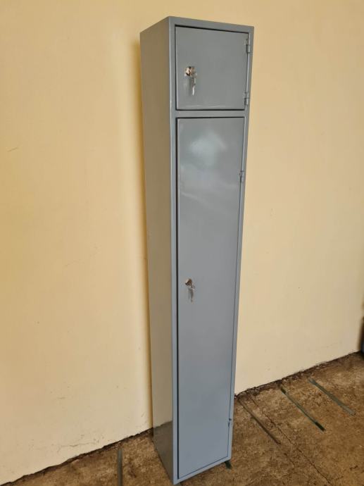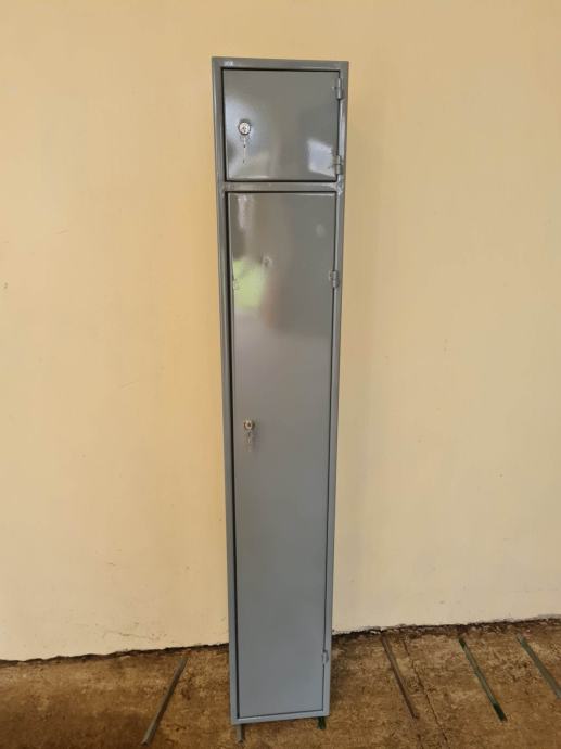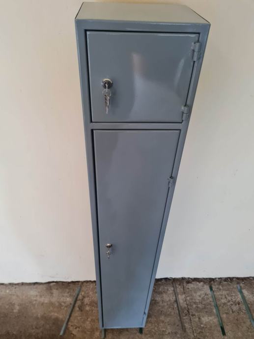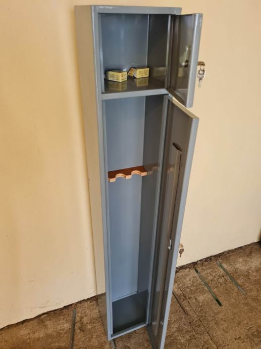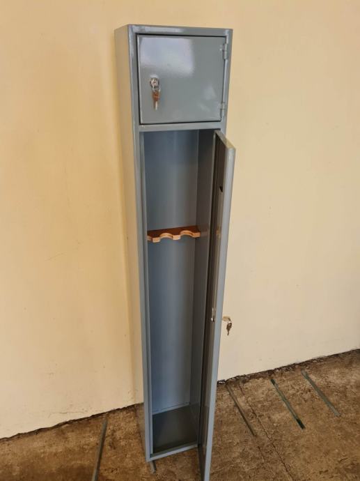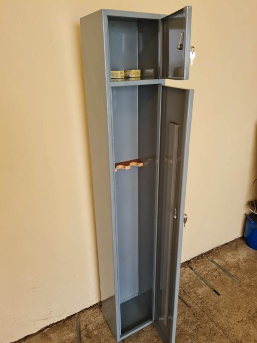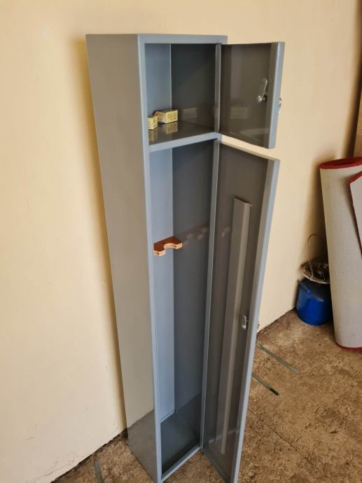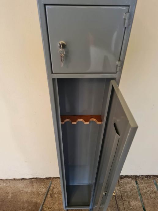 dimenzije: v 150cm, š 25cm, d 20cm, odvojeni pretinac za metke ili pištolj, na ključ, svaki se posebno zaključava, visina donjeg dijela ormara 130cm, gornjeg 20cm.